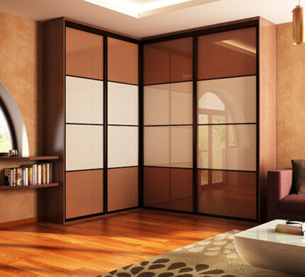 Угловой шкаф купе в гостиную со стеклом лакобель